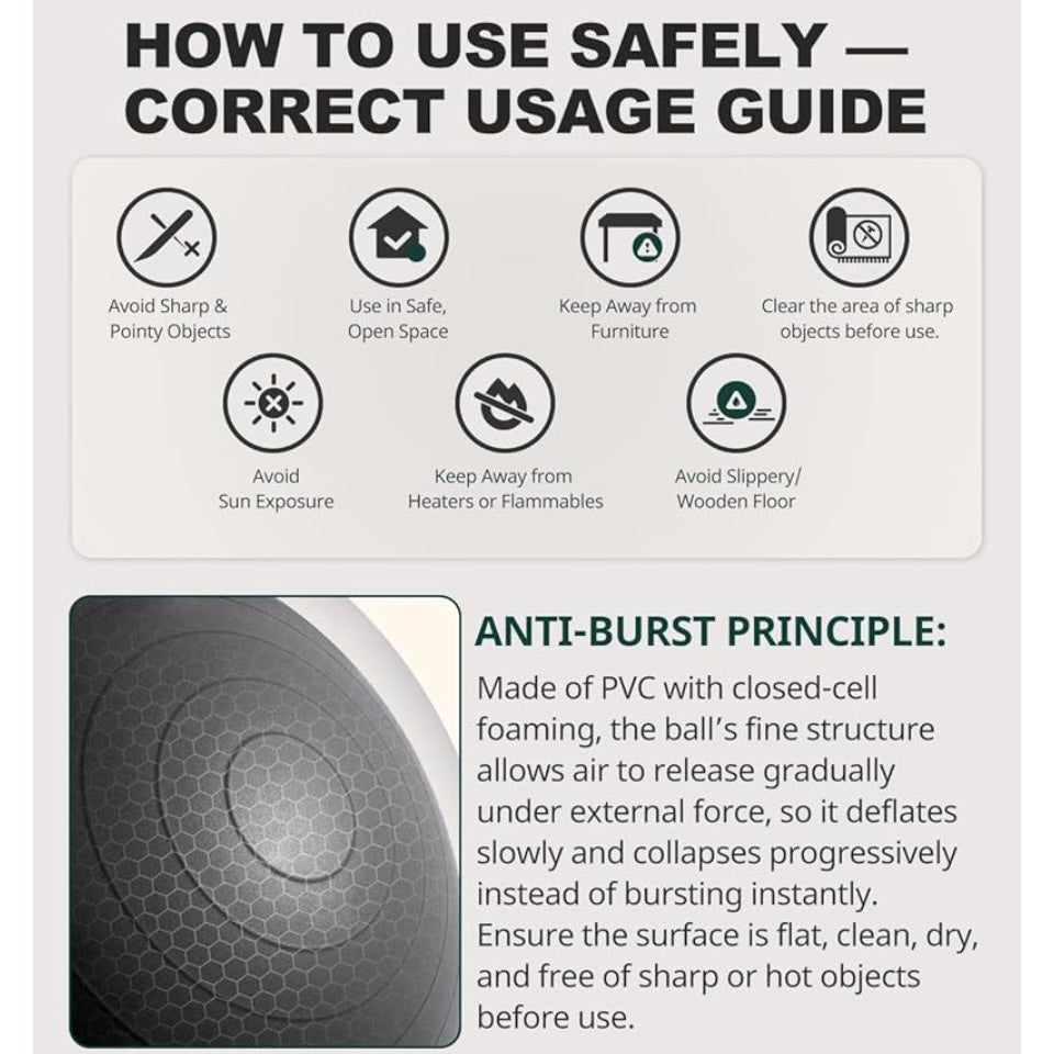 - Engineered to safely hold up to 330 lbs (150 kg) without losing shape. The burst-resistant structure with slow air release provides reliable performance and extra safety during all types of workouts.